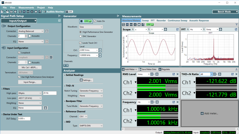 我们后来增加了工作台模式。工作台模式的目标是支持习惯于完全控制测量硬件的高级用户,他们只想启动软件并立即开始工作。(鲜为人知的事实:在我们确定“基准模式”这个名称之前,我们最初称之为“快速模式”。)虽然工作台模式和序列模式在测量功能方面基本等同,但在某些情况下,人们注意到测量结果的细微差异(例如,上面显示的THD+N结果适用于在序列模式和工作台模式下测量的相同设备)。为什么?
