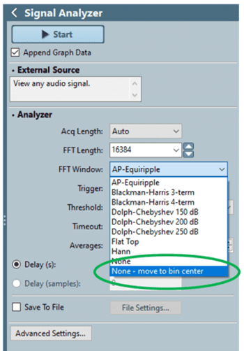 通过在FFT窗口下拉列表中进行新选择,对某些类型的信号改进了非同步信号的无窗分析(见图1)。通过选择 “无–移动到垃圾箱” 窗口选项,可以使用此新功能。选择后,确定采集信号中的主音,并对采集进行重新采样,使信号位于最近的FFT频率单元的中心。