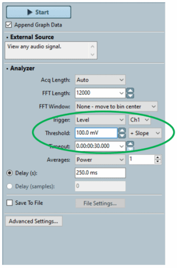 APx500序列模式信号分析仪和工作台模式FFT中一个严重缺失的功能是一个简单的电平触发器。APx500 7.0版中添加了此功能,可以将采集的开始设置为绝对水平阈值(图3)。这在分析APx分析仪本身未产生的信号(开环测量)时非常有用。