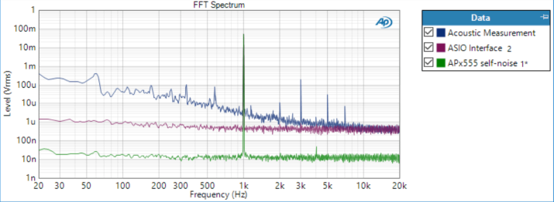 简单来说,APx555 的底噪比ASIO声卡低50dB,但ASIO 声卡底噪仍然比环境噪声低30dB,对于喇叭测量来说,这个动态余量已经足够了。